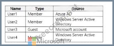 You have an Azure Active Directory (Azure AD) tenant named contoso.com that is synced to an Active Directory domain. The tenant contains the users shown in the following table.