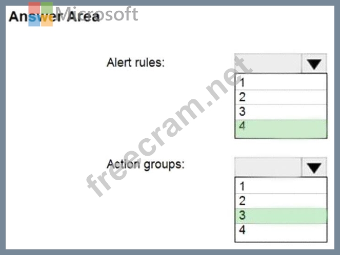 How many alert rules and action groups should you identify? To answer, select the appropriate options in the answer area.