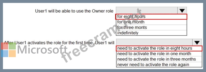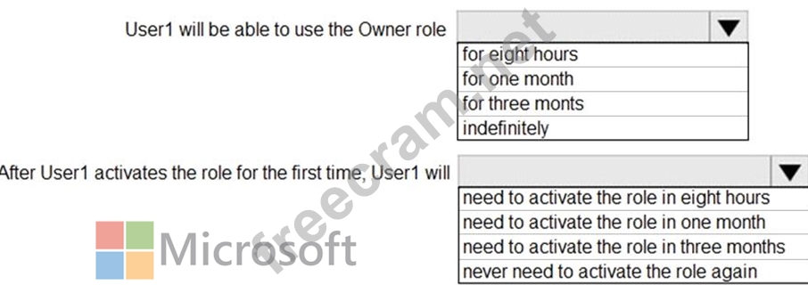 From Azure AD Privileged Identify Management, you assign the Owner role for the subscription to a user named User1, and you set the Assignment type to Active and Permanently eligible.