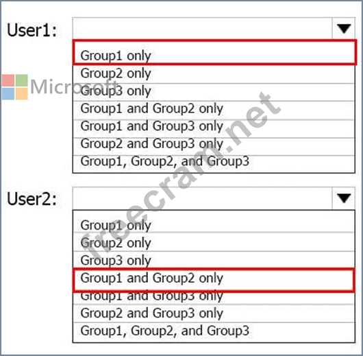 To which groups do User1 and User2 belong? To answer. select the appropriate options in the answer area.