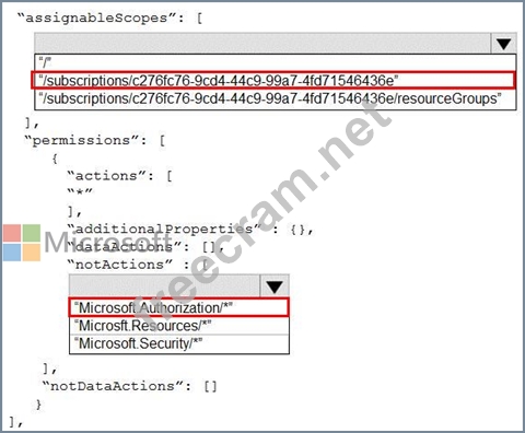 In the assignableScopes you need to mention the subscription ID where you want to implement the RBAC Box 2: "Microsoft.Authorization/*" Microsoft.Authorization/* is used to Manage authorization References: