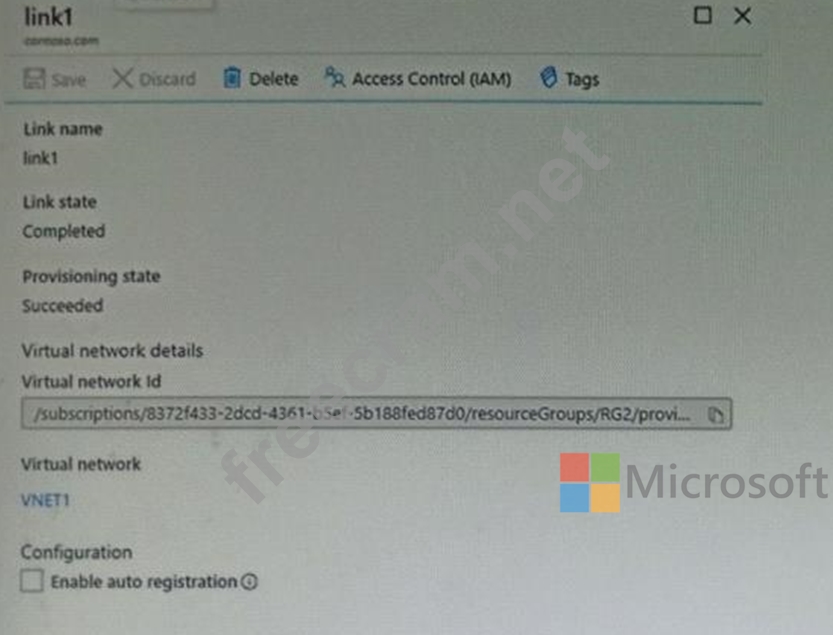 For contoso.com, you create a virtual network link named link1 as shown in the exhibit. (Click the Exhibit tab.)