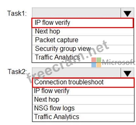 Task1: Identify a security rule that prevents a network packet from reaching an Azure virtual machine Task2: Validate outbound connectivity from an Azure virtual machine to an external host Which feature should you use for each task? To answer, select the appropriate options in the answer area.