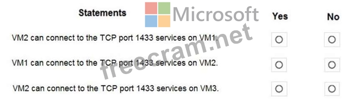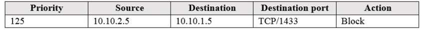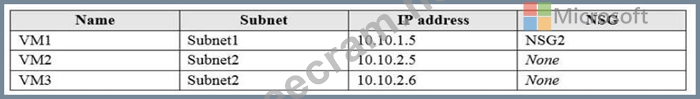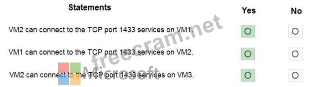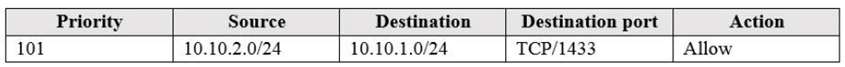 The inbound security rule for NSG1 allows TCP port 1433 from 10.10.2.0/24 (or Subnet2 where VM2 and VM3 are located) to 10.10.1.0/24 (or Subnet1 where VM1 is located) while the inbound security rule for NSG2 blocks TCP port 1433 from 10.10.2.5 (or VM2) to 10.10.1.5 (or VM1). However, the NSG1 rule has a higher priority (or lower value) than the NSG2 rule.