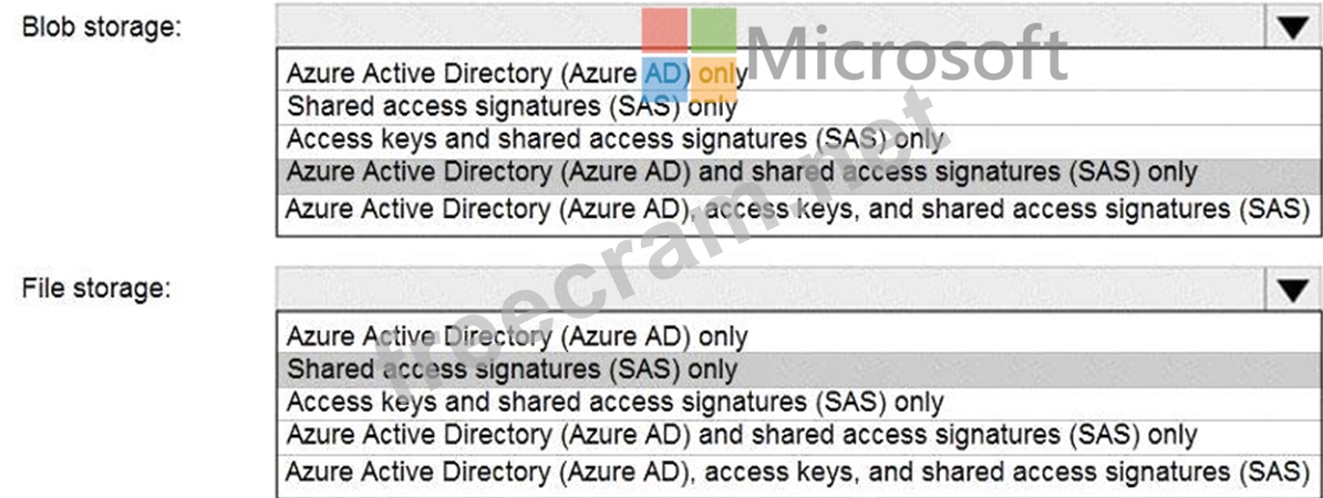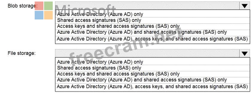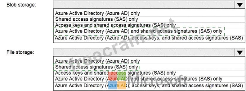 Which authentication method should you use for each type of storage? To answer, select the appropriate options in the answer area.