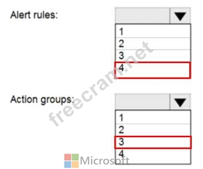 How many alert rules and action groups should you identify? To answer, select the appropriate options in the answer area.