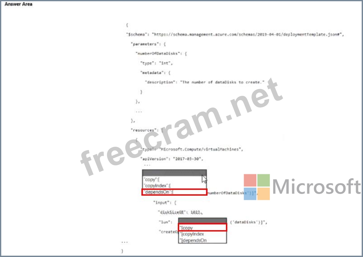 How should you complete the template? To answer select the appropriate options in the answer area NOTE: Each correct selection n worth one point.