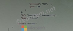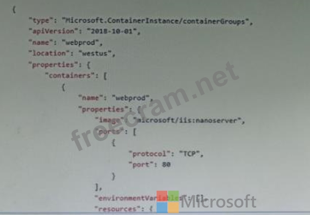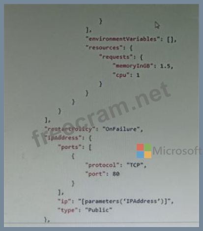 You plan to deploy an Azure container instance by using the following Azure Resource Manager template.