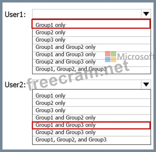 To which groups do User1 and User2 belong? To answer. select the appropriate options in the answer area.