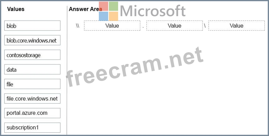 You create an Azure Storage account named contosostorage, and then you create a file share named data.