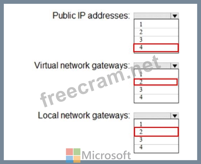 What is the minimum number of public IP addresses, virtual network gateways, and local network gateways required in Azure? To answer, select the appropriate options in the answer area.