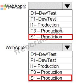 WebApp2 must be able to access the resources located on an Azure virtual network What is the least costly plan that you can use to deploy each web app? To answer, select the appropriate options in the answer area.