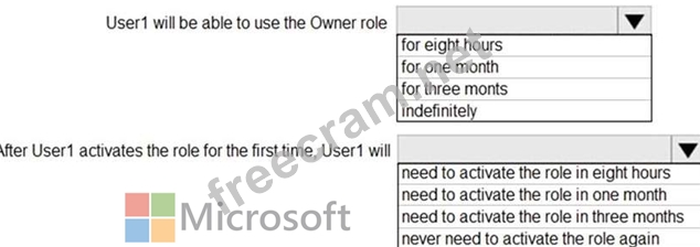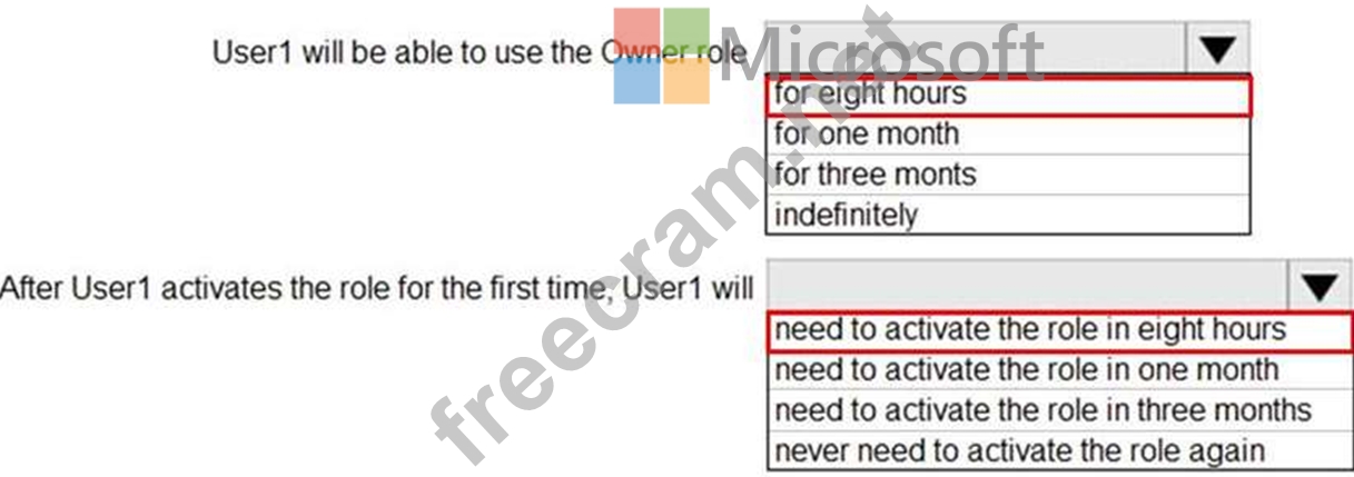 From Azure AD Privileged Identify Management, you assign the Owner role for the subscription to a user named User1, and you set the Assignment type to Active and Permanently eligible.