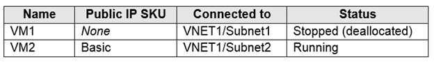 Solution: You create a Standard SKU public IP address, associate the address to the network interface of VM1, and then stop VM2.