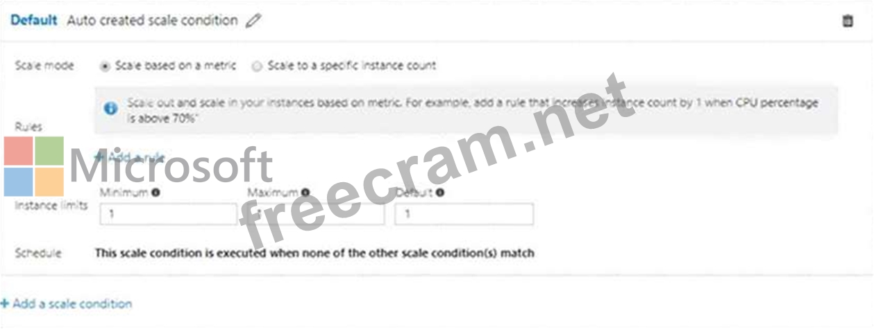 You need to configure WebApp1 to add additional instances of the app when CPU usage exceeds 70 percent for 10 minutes.