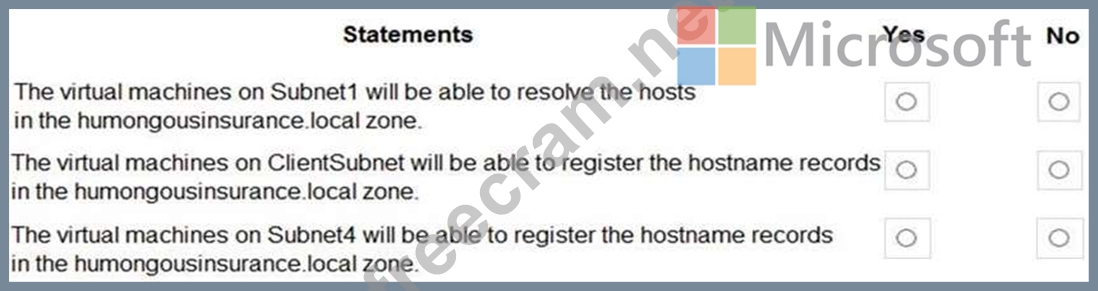 A virtual network named ClientResources-VNet that will contain one subnet named ClientSubnet You plan to create a private DNS zone named humongousinsurance.local and set the registration network to the ClientResources-VNet virtual network.
