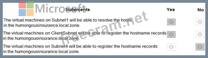 Only VMs in the registration network, here the ClientResources-VNet, will be able to register hostname records. Since Subnet4 not connected to Client Resources Network thus not able to register its hostname with humongoinsurance.local Reference:
