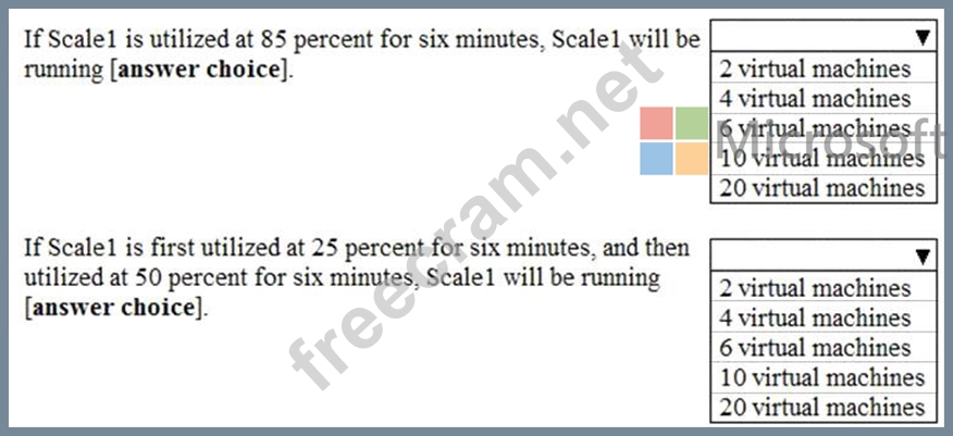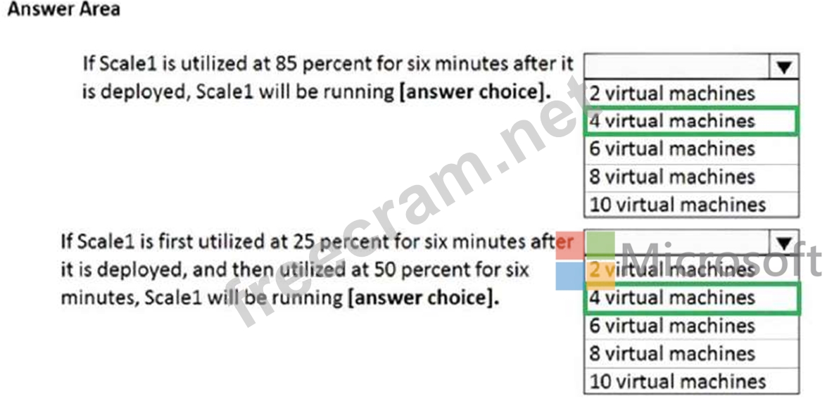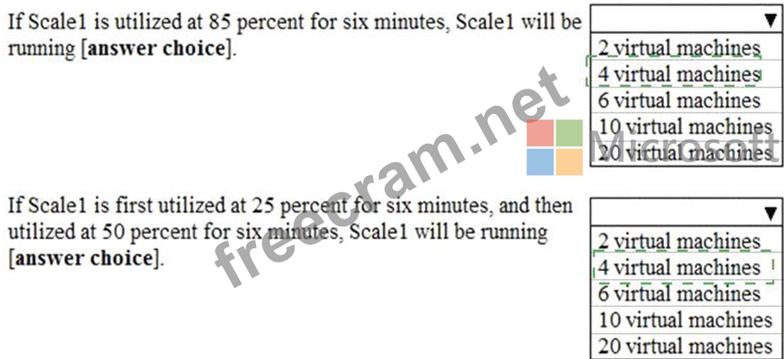 The answers given are correct. 1st question 6, the only info given is that the starting count of vm instances is 4 and 2 are added for 6 total. 2nd question the minimum it can go is 2 and it stays at 2 for the questions. 6 and 2 are the correct answers.