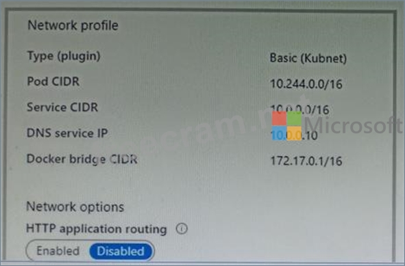 You deploy an Azure Kubernetes Service (AKS) cluster that has the network profile shown in the following exhibit.