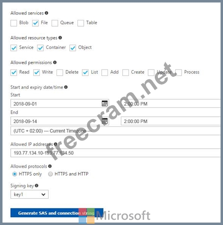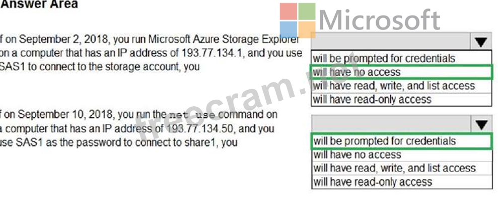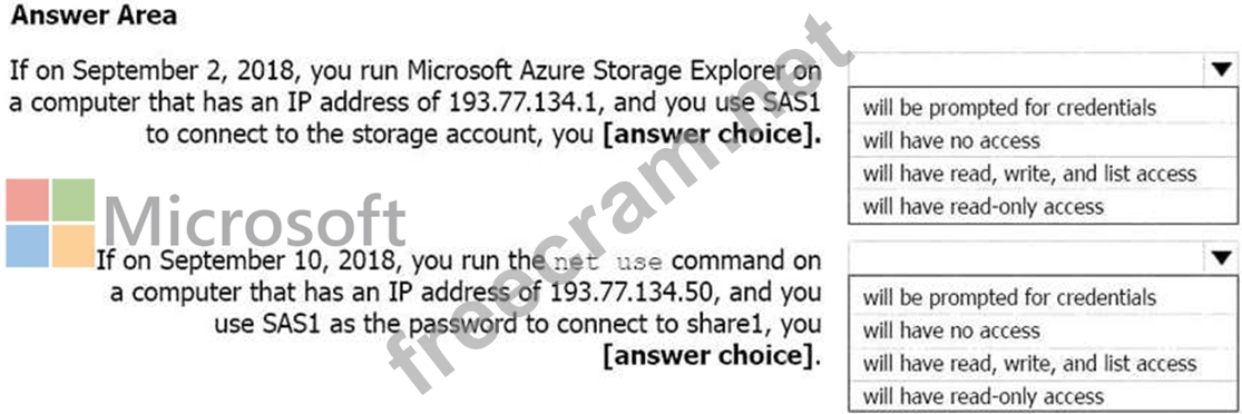 The net use command is used to connect to file shares.To mount an Azure file share, you will need the primary (or secondary) storage key. SAS keys are not currently supported for mounting. Based on the provided SAS exhibit, IP address is an allowed IP and also on given date SAS is active, but account storage key is must to have to run the "net use" command , which is not provided in the question. Hence "will be prompted for credentials" is correct option for this.