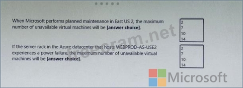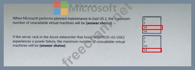 There are 2 fault domains. The 14 VMs are shared across the 2 fault domains, so 7 VMs in each fault domain. A rack failure will affect one fault domain so 7 VMs will be offline.