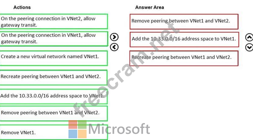 You need to add the address space of 10.33.0.0/16 to VNet1. The solution must ensure that the hosts on VNet1 and VNet2 can communicate.