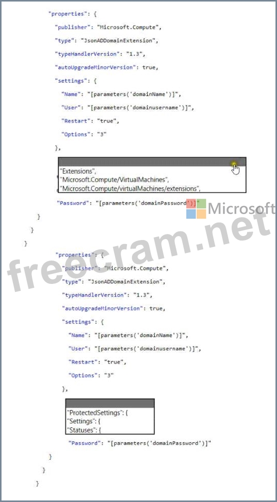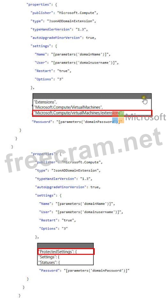 How should you complete the Azure Resource Manager (ARM) template? To answer, select the appropriate options in the answer area.