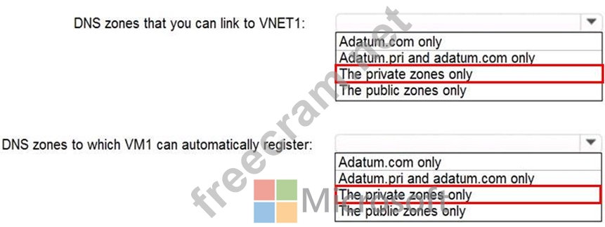 You need to identify which DNS zones you can link to VNET1 and the DNS zones to which VM1 can automatically register.