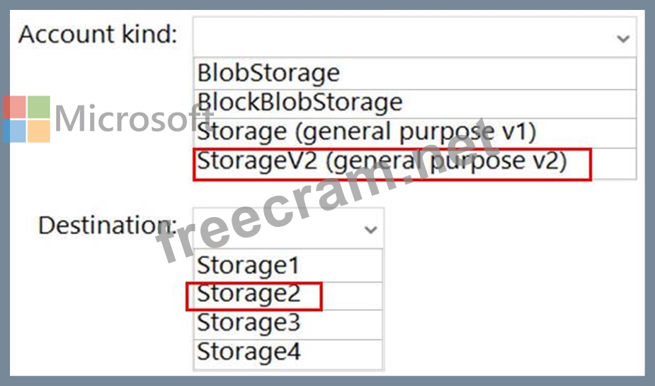 Which type of storage account should you use, and which account should you configure as the destination storage account? To answer, select the appropriate options in the answer area.