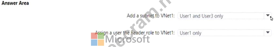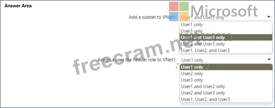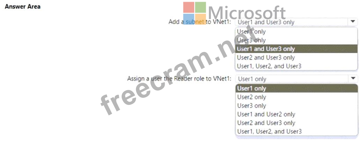 You have an Azure subscription named Subscription1 that contains a virtual network named VNet1. You add the users in the following table.