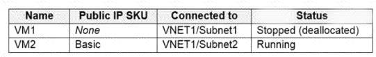 Solution: You create a Basic SKU public IP address, associate the address to the network interface of VM1, and then start VM1.