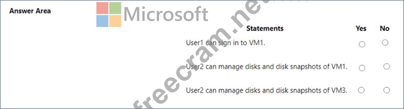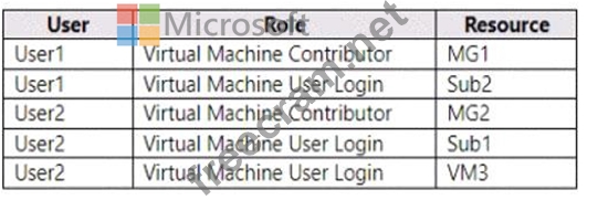 Explanation: User 2 has the Disk Snapshot Contributor role assigned at the scope of MG2. This role allows the user to manage disk snapshots in the management group. VM3 is a virtual machine in RG3, which is in Sub2, which is in MG2. Therefore, User 2 has the permission to manage disks and disk snapshots of VM3.