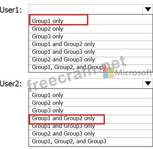 To which groups do User1 and User2 belong? To answer. select the appropriate options in the answer area.