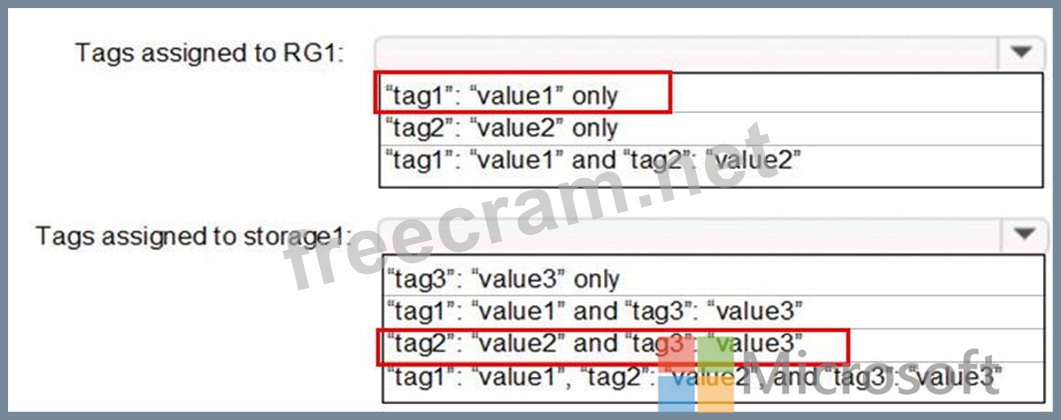 You assign an Azure policy named Policy1 to Subscription1 by using the following configurations: