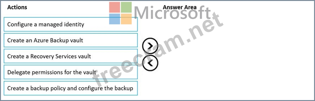 You have an Azure subscription that contains a virtual machine name VM1. VM1 has an operating system disk named Disk1 and a data disk named Disk2. You need to back up Disk2 by using Azure Backup. Which three actions should you perform in sequence? To answer, move the appropriate actions from the list of actions to the answer area and arrange them in the correct order.