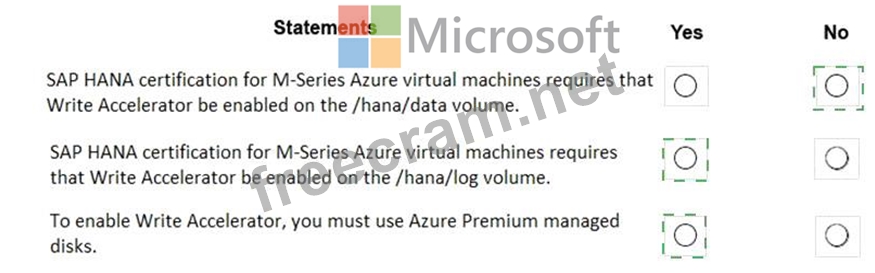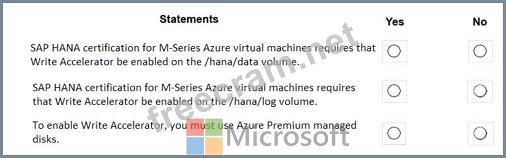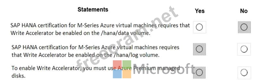 Explanation Box 1: No Box 2: Yes The minimum SAP HANA certified conditions for the different storage types are: Azure Premium SSD - /hana/log is required to be cached with Azure Write Accelerator. The /hana/data volume could be placed on Premium SSD without Azure Write Accelerator or on Ultra disk Box 3: Yes References: https://docs.microsoft.com/en-us/azure/virtual-machines/workloads/sap/hana-vm-operations-storage