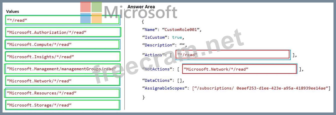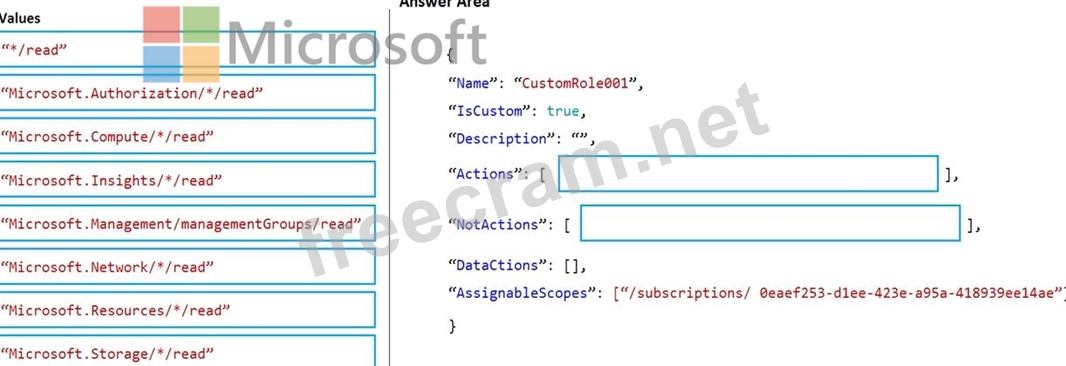 How should you configure the role-based access control (RBAC) role definition? To answer, drag the appropriate values to the correct targets. Each value may be used once, more than once, or not at all. You may need to drag the split bar between panes or scroll to view content.