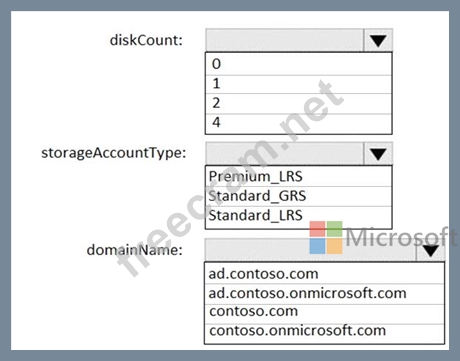 Which values should you provide for diskCount, StorageAccountType, and domainName? To answer, select the appropriate options in the answer area.