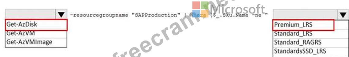 Before putting the SAP environment on Azure into production, which command should you run to ensure that the virtual machine disks meet the business requirements? To answer, select the appropriate options in the answer area.