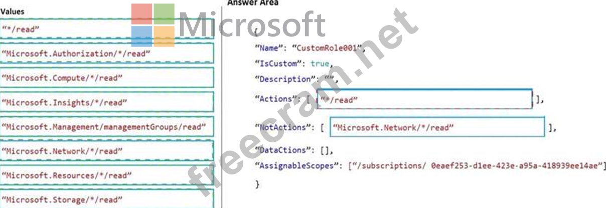 How should you configure the role-based access control (RBAC) role definition? To answer, drag the appropriate values to the correct targets. Each value may be used once, more than once, or not at all. You may need to drag the split bar between panes or scroll to view content.