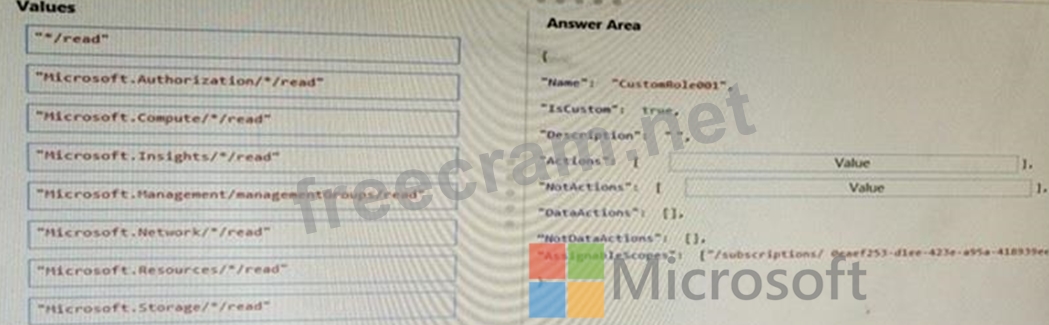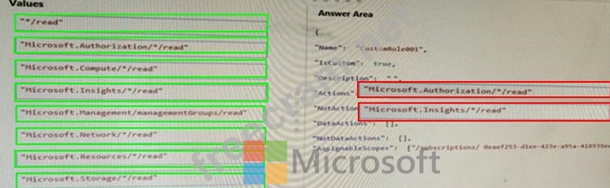How should you configure the role-based access control (RBAC) role definition? To answer, drag the appropriate values to the correct targets. Each value may be used once, more than once, or not at all. You may need to drag the split bar between panes or scroll to view content.