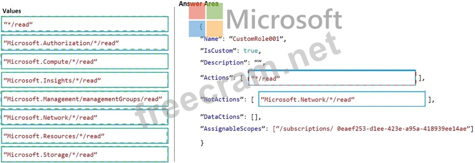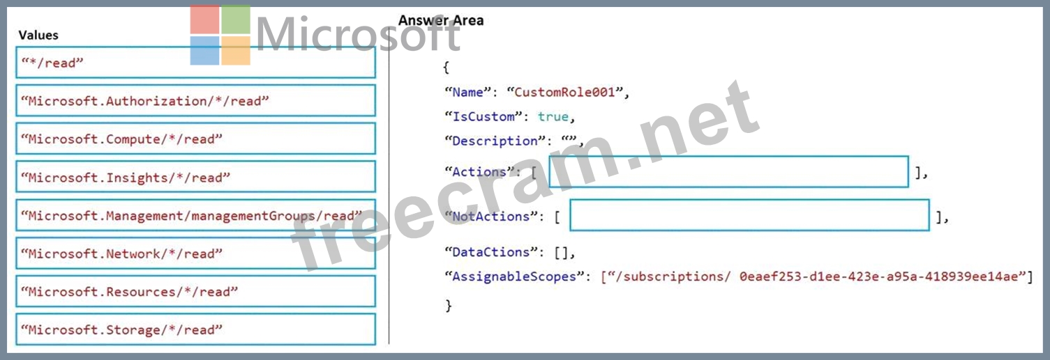 How should you configure the role-based access control (RBAC) role definition? To answer, drag the appropriate values to the correct targets. Each value may be used once, more than once, or not at all. You may need to drag the split bar between panes or scroll to view content.