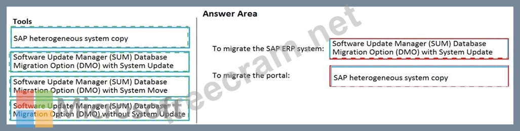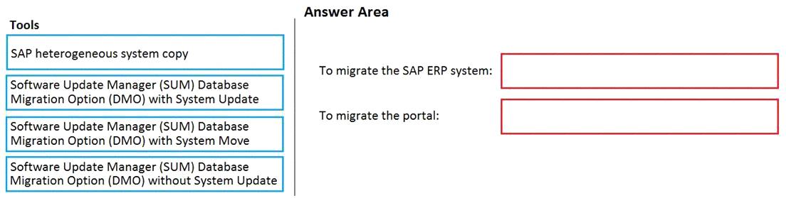 You need to recommend a migration strategy to migrate the SAP ERP system and the portal to Azure. The solution must be hosted on SAP HANA.