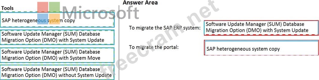 You need to recommend a migration strategy to migrate the SAP ERP system and the portal to Azure. The solution must be hosted on SAP HANA.