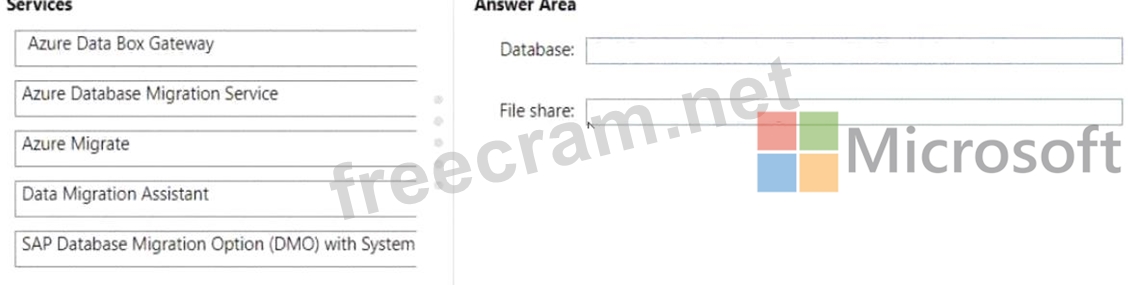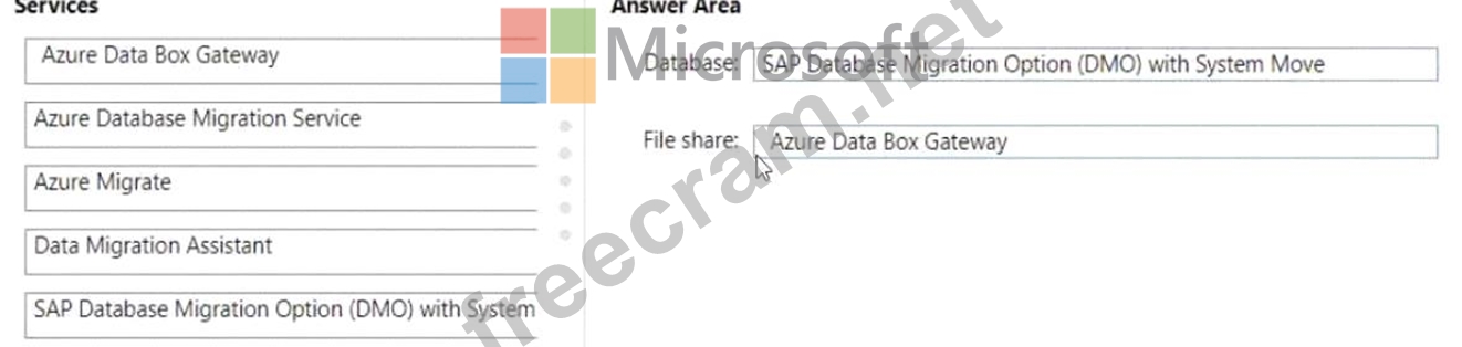 You have an on-premises SAP landscape that uses a DB2 database and contains an SAP Financial Accounting (SAP FIN) deployment. The deployment contains a file share that stores 50 TB of bitmap files. You plan to migrate the on-premises SAP landscape to SAP HANA on Azure (Large Instances) and Azure Files shares.