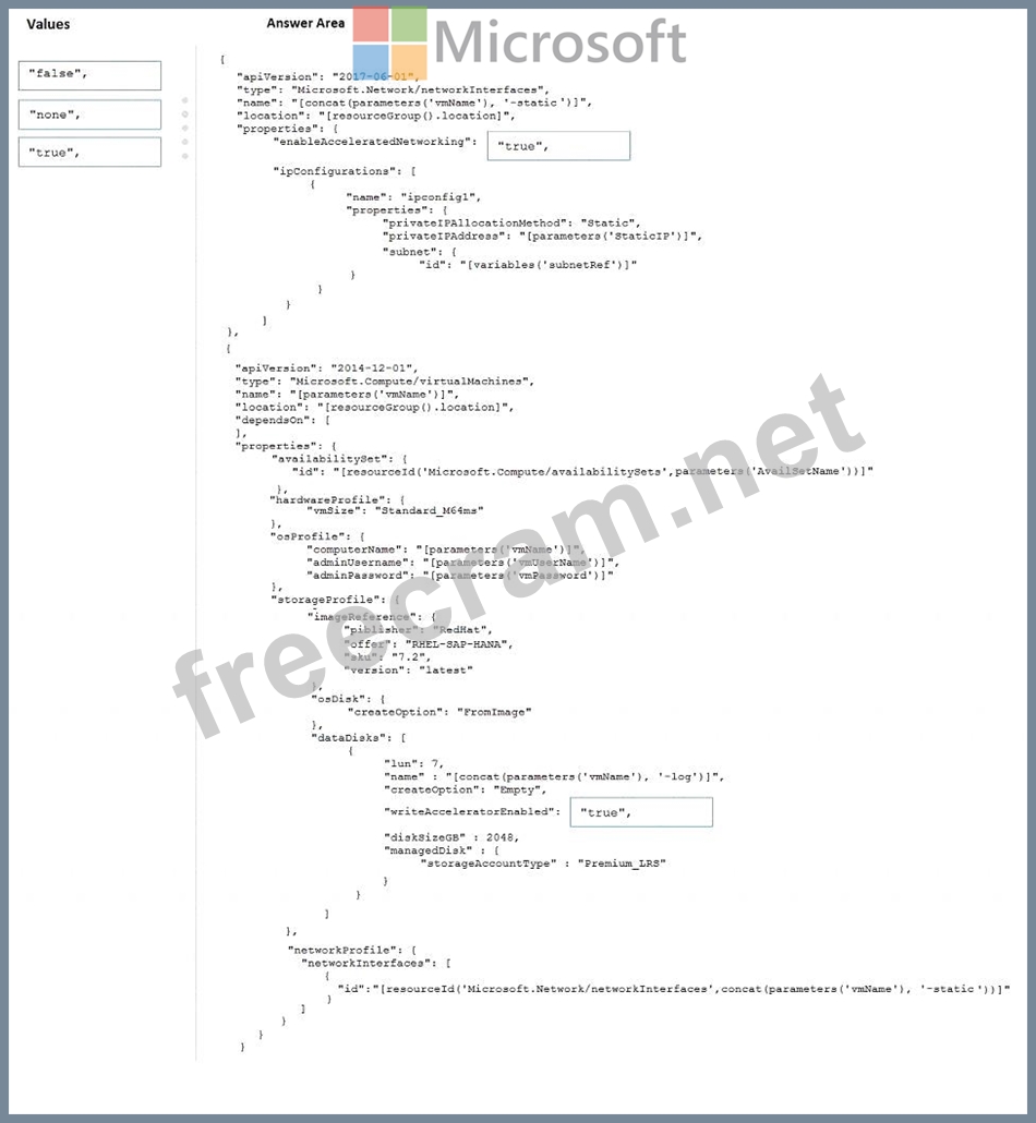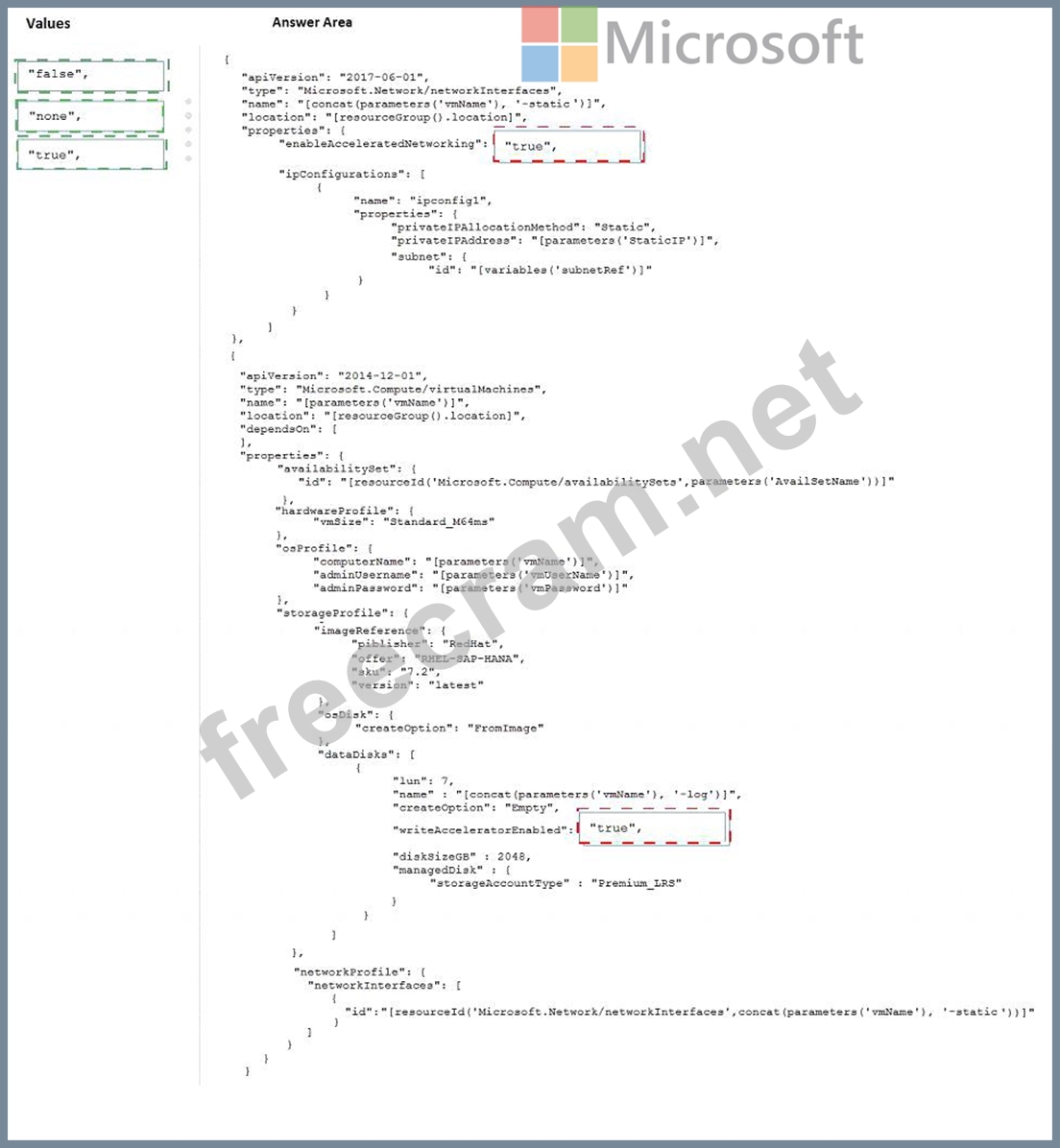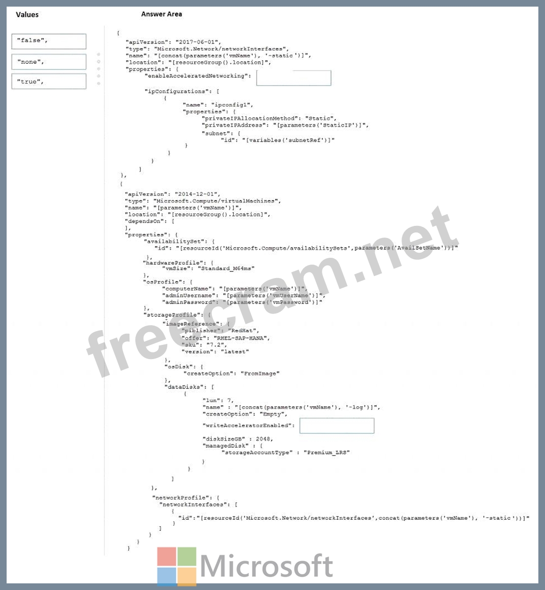 How should you configure Accelerated Networking and Write Accelerator in the template? To answer, drag the appropriate values to the correct targets. Each value may be used once, more than once, or not at all. You may need to drag the split bar between panes or scroll to view content.