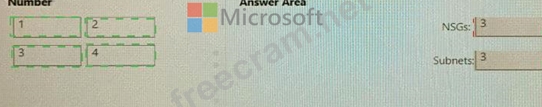 What is the minimum number of network security groups (NSGs) and subnets required? To answer, drag the appropriate number to the correct targets. Each number may be used once, more than once, or not at all. You may need to drag the split bar between panes or scroll to view content.