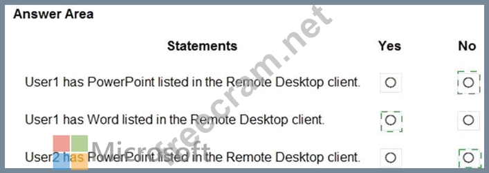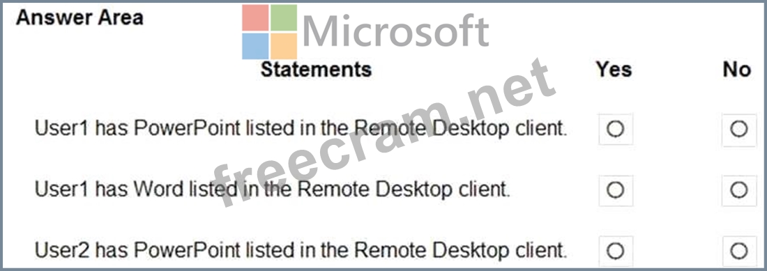 You network contains an on-premises Active Directory domain that syncs to an Azure Active Directory (Azure AD) tenant. The domain contains the users shown in the following table. You have a Windows Virtual Desktop deployment that contains the application groups shown in the following table. You have the workspaces shown in the following table. For each of the following statements, select Yes if the statement is true. Otherwise, select No. NOTE: Each correct selection is worth one point.