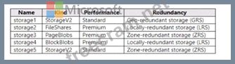 You have an Azure Virtual Desktop deployment and the Azure Storage accounts shown in the following table.