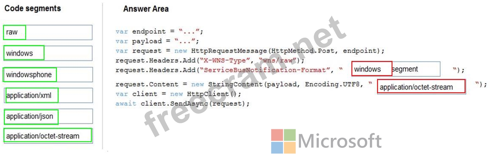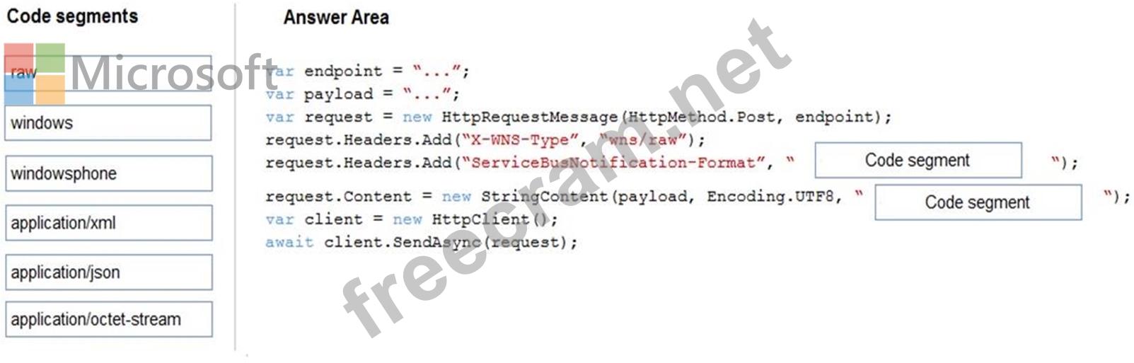 How should you complete the code segment? To answer, drag the appropriate code segments to the correct locations. Each code segment may be used once, more than once, or not at all. You may need to drag the split bar between panes or scroll to view content.
